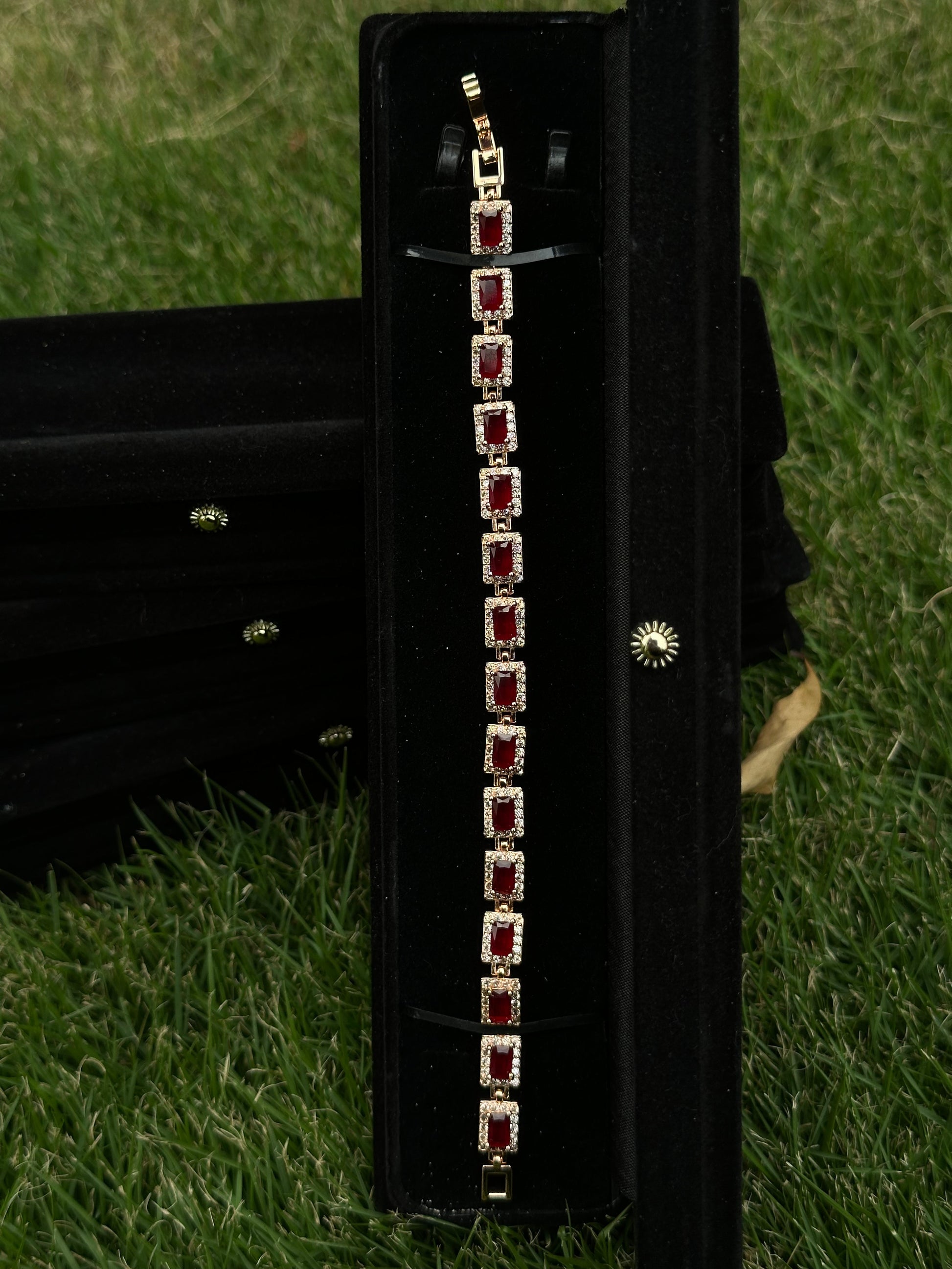 - Stone Details: Ruby red rectangular gemstones, framed with shimmering crystal accents