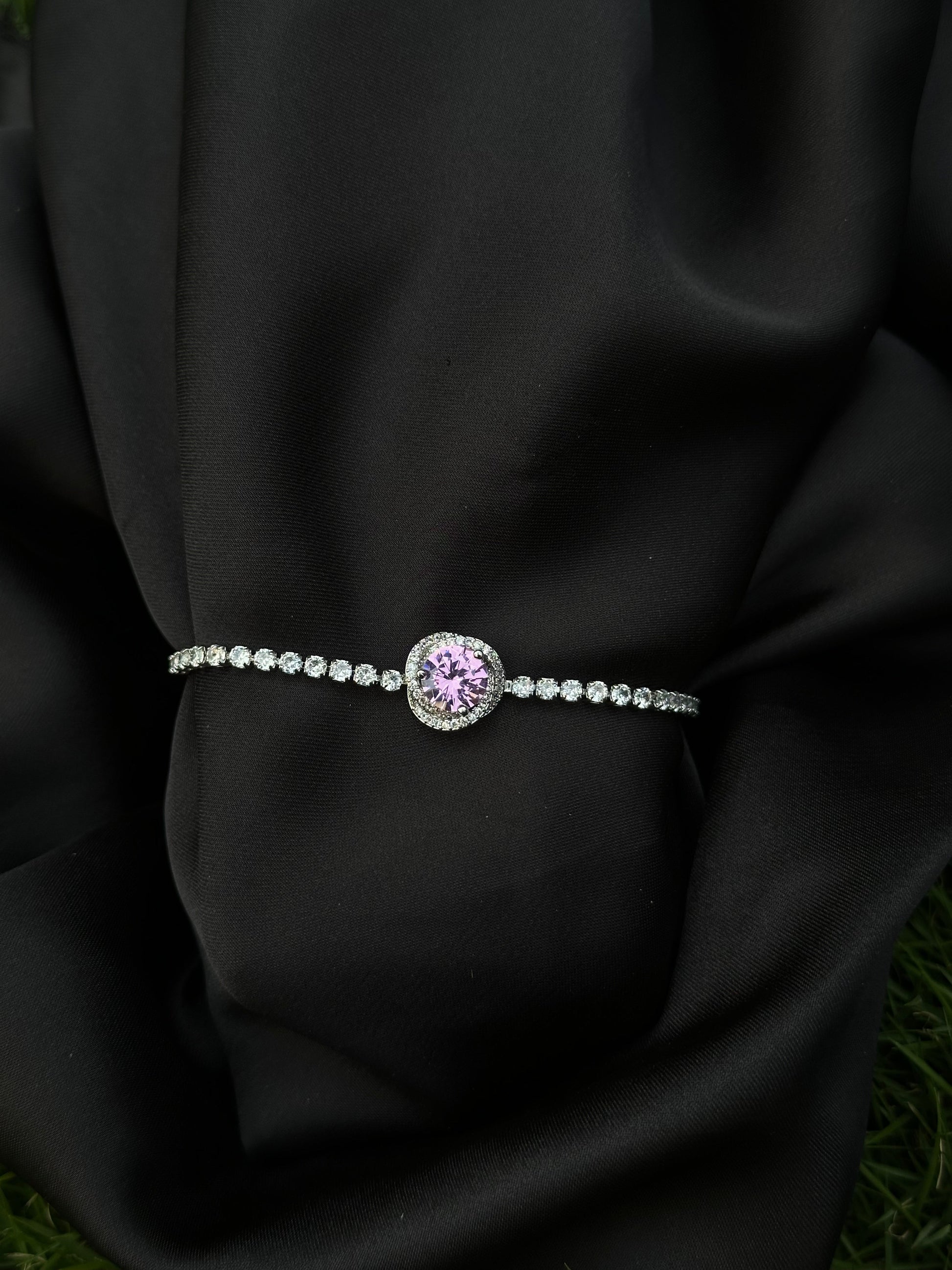 - Design: A luxurious and timeless bracelet showcasing a vibrant violet stone, haloed by diamonds and followed by a symmetrical diamond band—adds a regal touch to any ensemble.